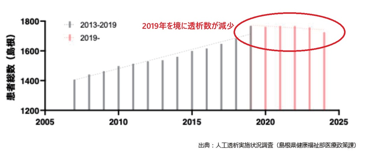 これらの取り組みにより、2019年をピークに増え続けていた透析患者数は近年減少に転じています。全国と比べても、島根県では科学的根拠に基づく治療が先進的に行われていることが示されました。