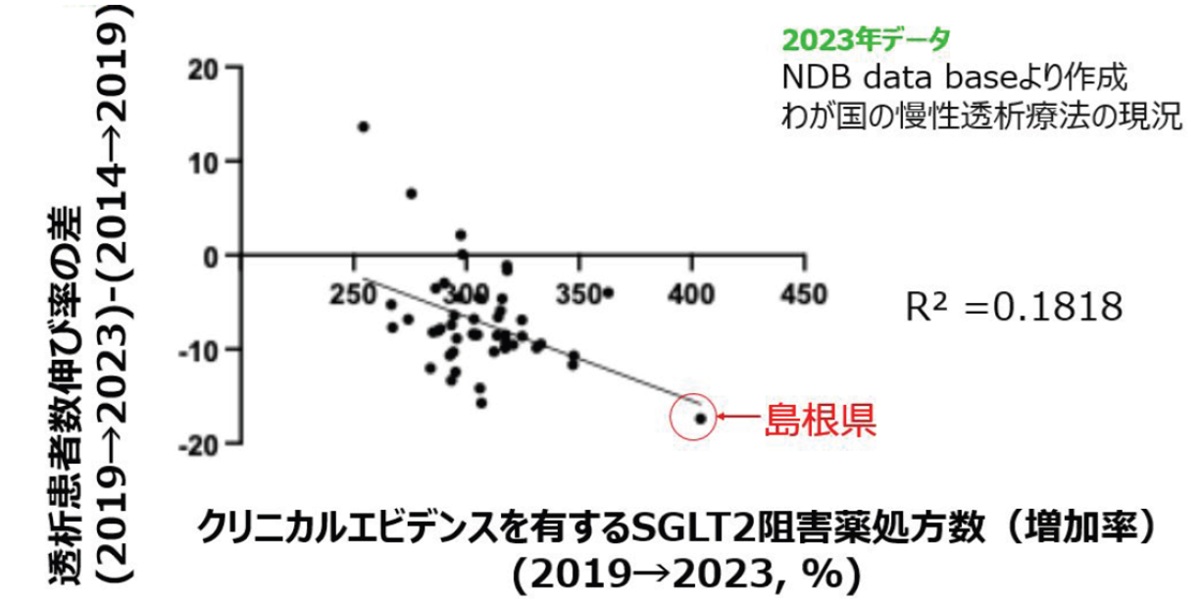 島根県では、2019年以降、糖尿病が重症化する可能性がある患者さんを中心に、糖尿病治療薬であるSGLT2阻害薬を積極的に使用し、その後、心不全やCKDの患者さんにも処方を広げてきました。さらに、2型糖尿病を伴うCKDに有効な薬剤の導入や、糖尿病の有無を問わずCKDの進行を抑えるための治療を、より積極的に行ってきました。また、末期腎不全に至った患者さんへの腎移植も、2025年11月までに15例実施されています。