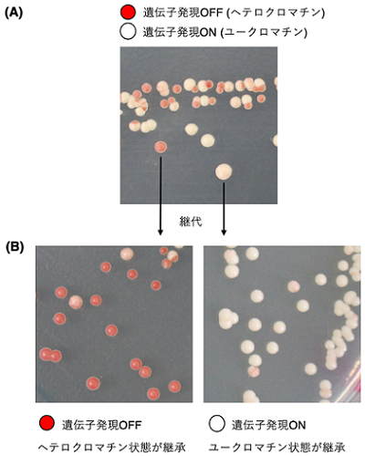 (A)サブテロメアにade6遺伝子を挿入した分裂酵母のコロニー。細胞(コロニー)ごとに、ade6遺伝子の発現状態に多様性がある(赤いコロニーはade6遺伝子がOFFのヘテロクロマチン状態、白いコロニーはade6遺伝子がONのユークロマチン状態を反映)。