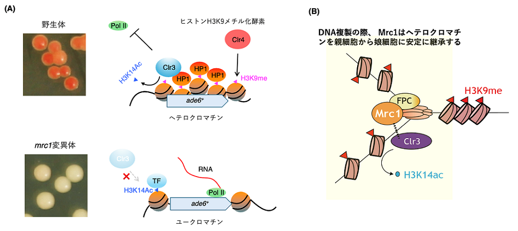 (B)Mrc1はDNA複製フォーク上で機能し、DNAの正常な複製を監視しつつ、H3K14の脱アセチル化を介して、ヘテロクロマチンの安定な維持・継承を促進する。