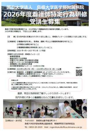 公開日 2025年11月21日 2026年度看護師特定行為研修募集要項を看護部ホームページに掲載しました。 https://nursing-med-shimane-u.jp/specific-training