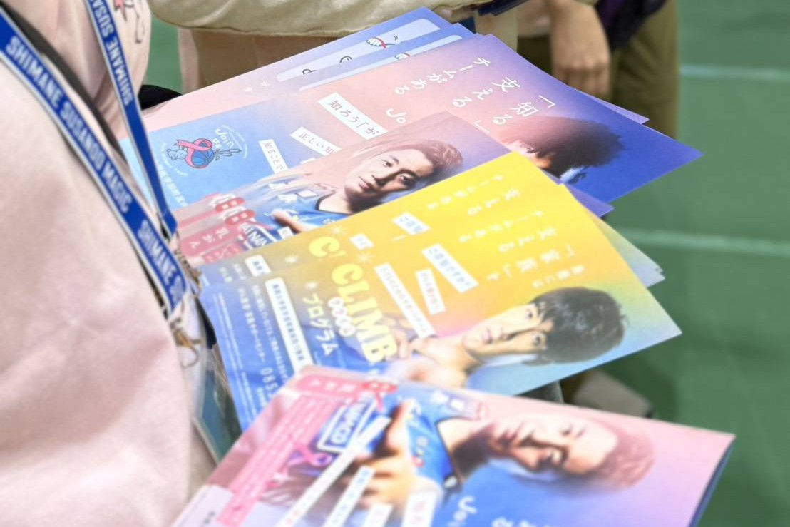 また、島根スサノオマジックの選手が登場するオリジナルリーフレットの配布やチャリティグッズの販売、募金にも多くの方にご参加いただきました。チャリティや 募金 にご協力くださった皆さまの温かいお気持ちに、心より感謝申し上げます。収益は、乳がん啓発活動や検診受診率向上、医療者の育成、ならびにがんに罹患した親をもつ子どもを支援するCLIMB ® プログラムの活動に活用される予定です。