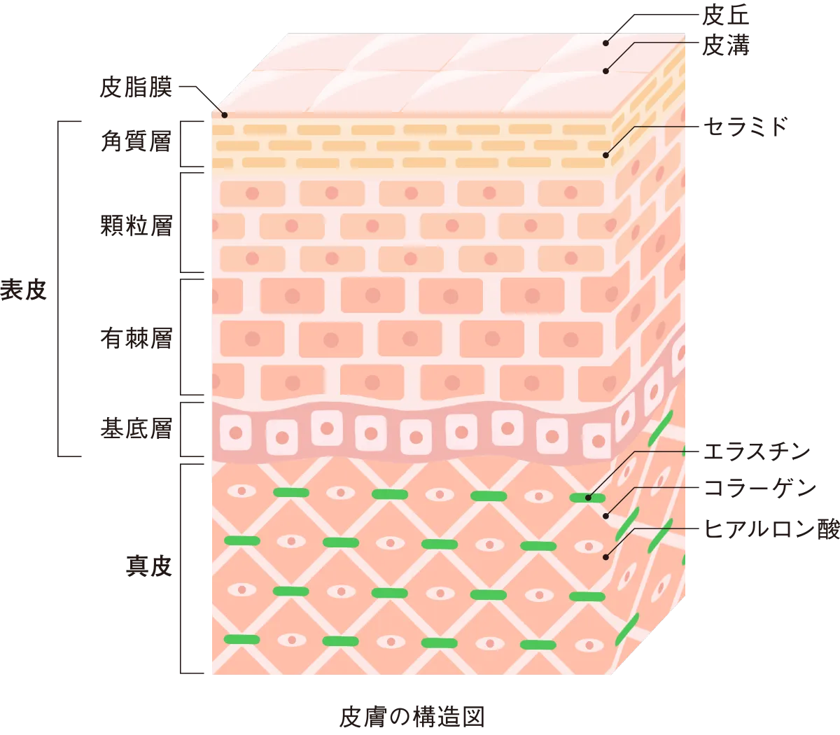 私たちの肌は、「表皮」「真皮」「皮下組織」の3層から構成されており、表皮のもっとも外側にある「角質層」の水分量が20〜30%の水分を保持している状態であれば、潤いのある健康的な肌といえます。