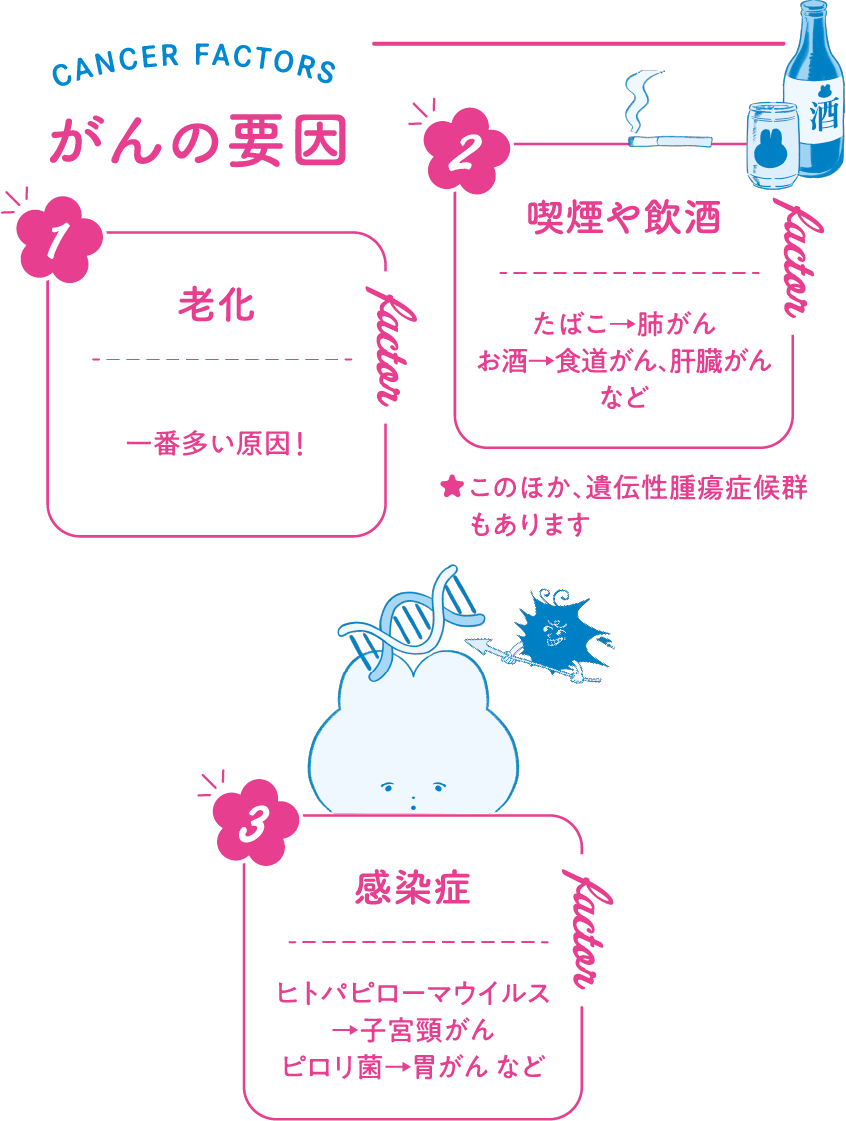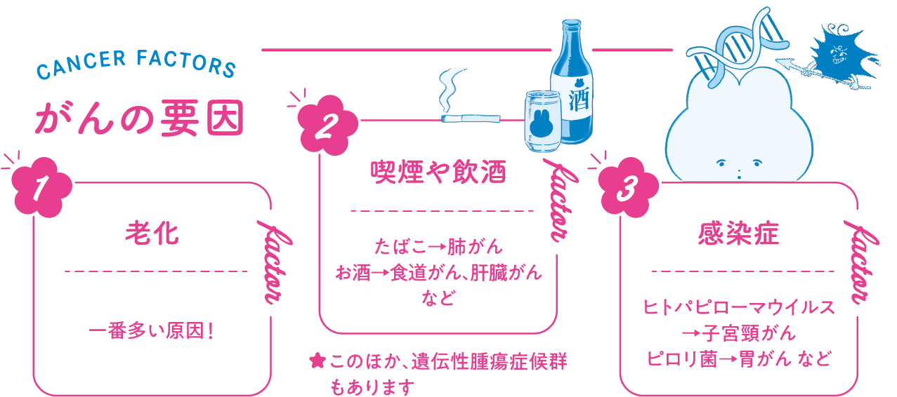 がんは細胞の遺伝子異常によって発生します。遺伝子とは、生物の体を作る設計図のDNAに含まれる情報単位。A・T・C・Gという4種類の塩基配列として記録されます。この配列の一部が、加齢に加え、タバコ・お酒といった生活習慣などが影響して変化。感染症の罹患でも起こり得ます。通常はそれを修復する力がありますが、対応しきれなくなると正常な細胞ががん細胞に変異します。