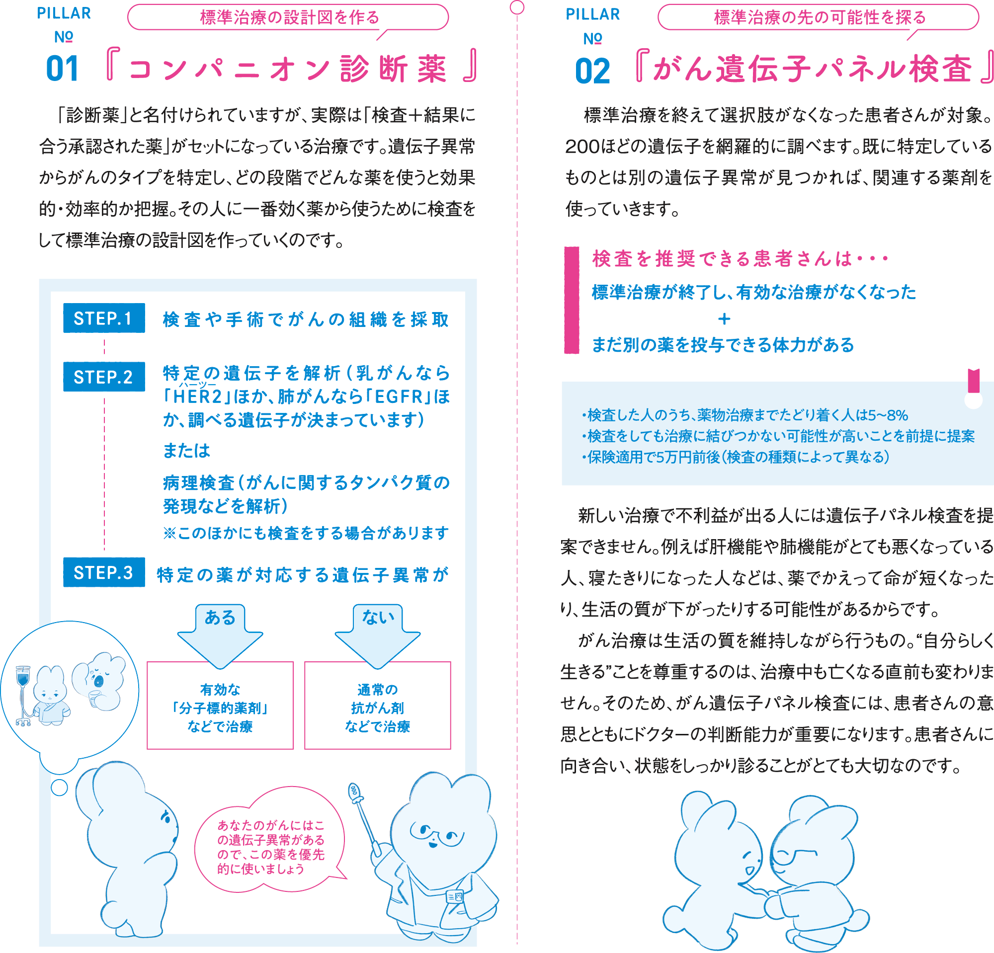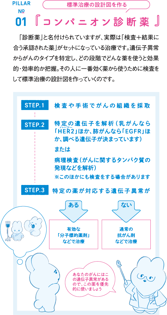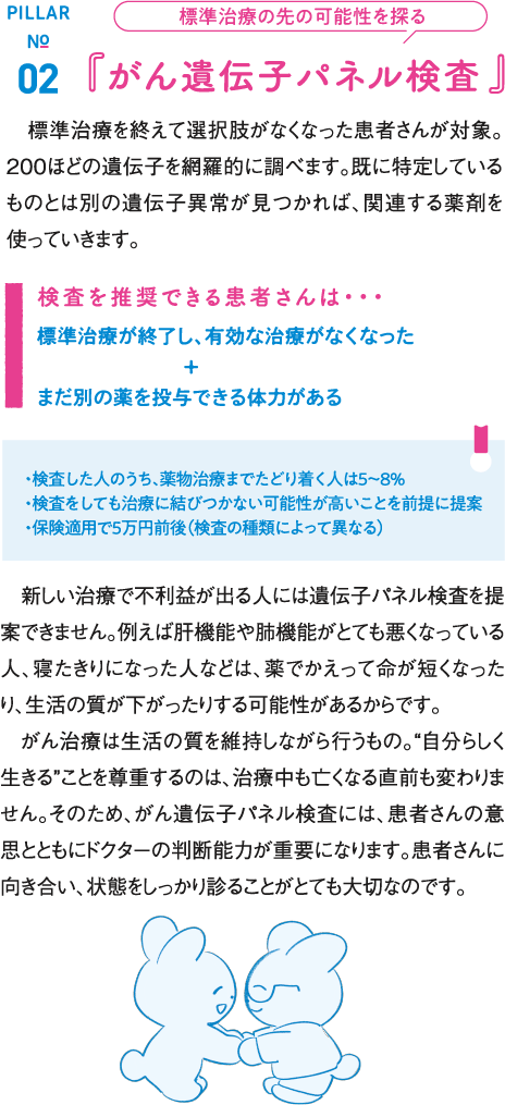 これによって「この薬が合うので、優先的に使おう」「この薬を基本の抗がん剤と一緒に使おう」と患者さんごとのがん細胞に合わせて薬を選択して、治療できるようになりました。また、その人のがんの性質や進行状態に合わせ、段階的な治療のスケジュールを組む「コンパニオン診断薬」がスタンダードに。個人個人の最適な設計図のもとで、効率的に治療ができる時代になっています。こういった遺伝子に関わるがん医療を「がんゲノム医療」と言います。