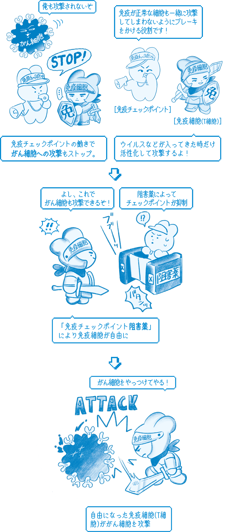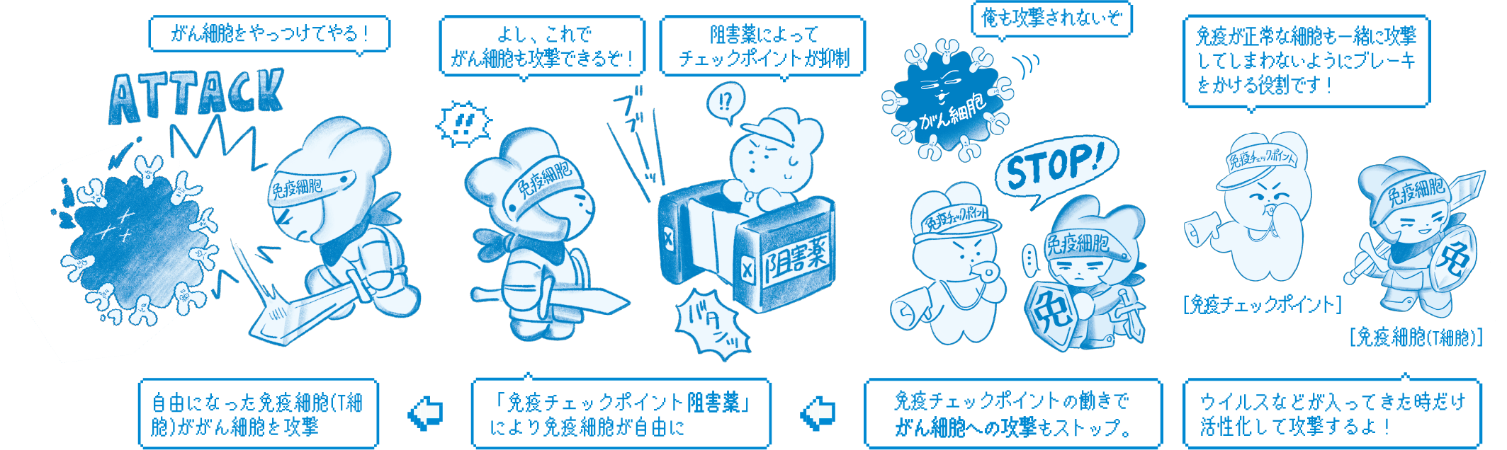 この「免疫チェックポイント」は、免疫がウイルスや細菌などの異物だけを攻撃し、正常な細胞を傷つけないようにブレーキをかけます。しかし、この機能があることで、免疫ががん細胞を攻撃することができません。阻害薬がこのブレーキを外すことで、免疫にがん細胞を攻撃させます。