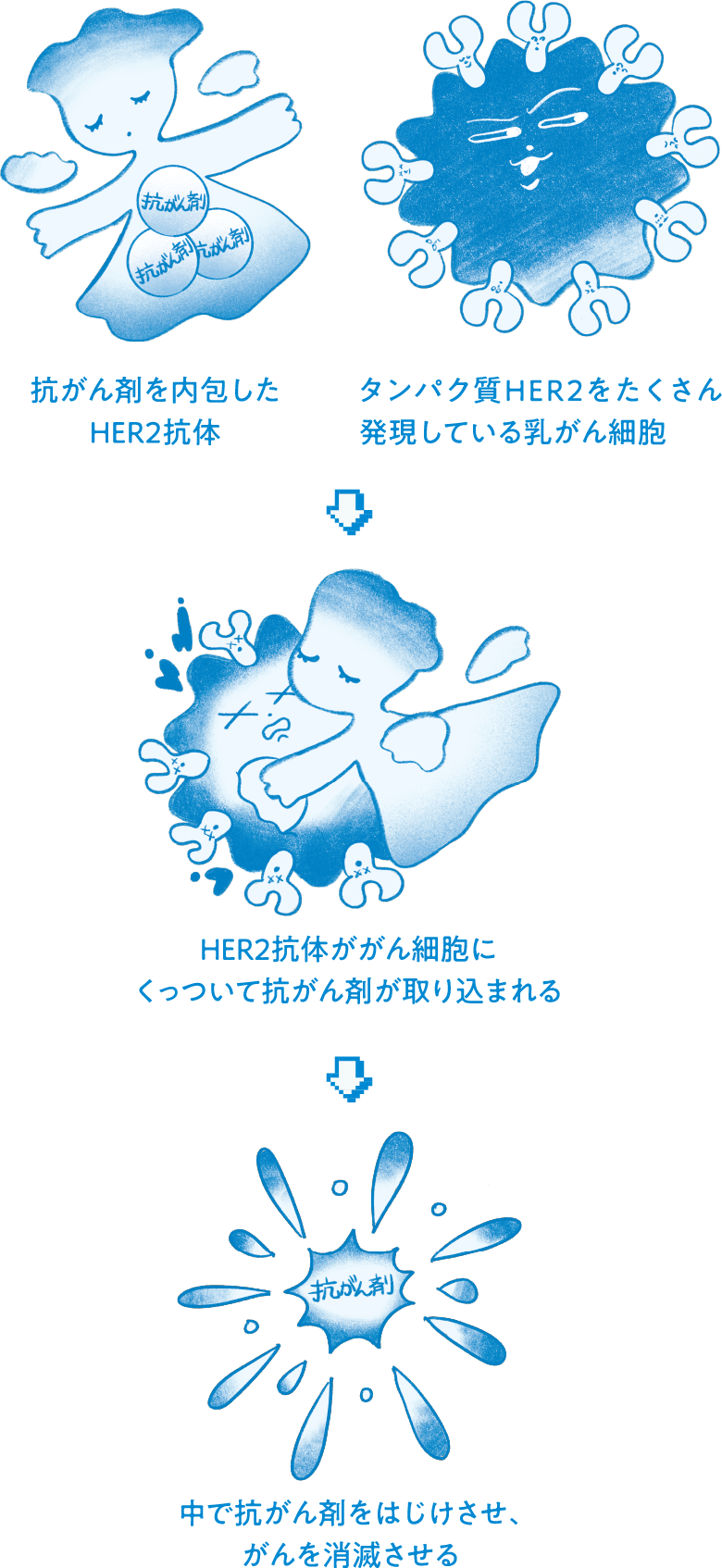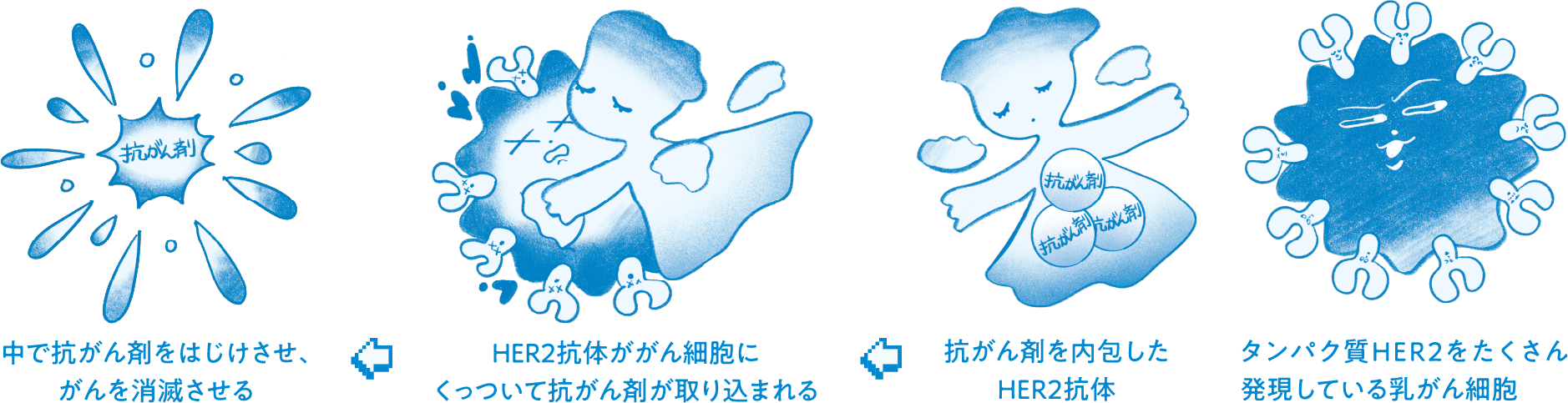 抗がん剤は単独で投与すると正常細胞にもダメージを与えてしまうことがありますが、薬を抗体に埋め込むことによって、がん細胞の中に入ってから薬が弾けるので、高い濃度で投薬でき、従来の抗体薬よりも高い効果を発揮します。手術の後に使うことも多いです。一方で抗がん剤が正常細胞に入りにくいとはいえ副作用はあるので、医師と相談しながら調整する必要があります。