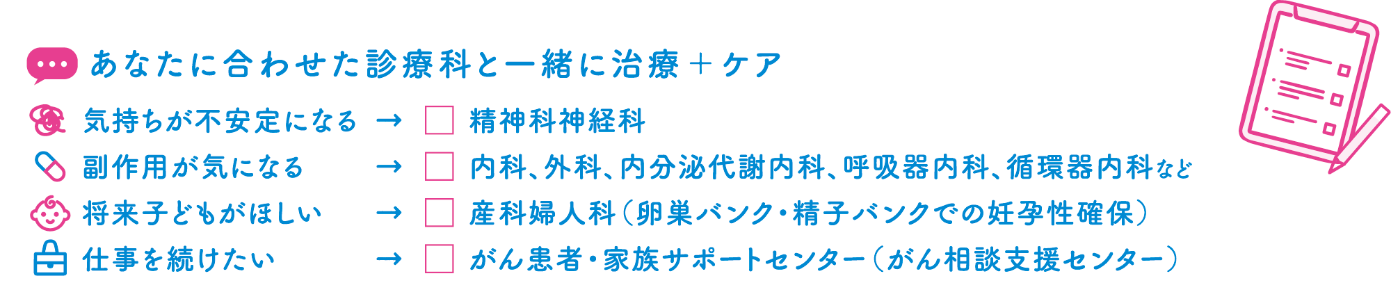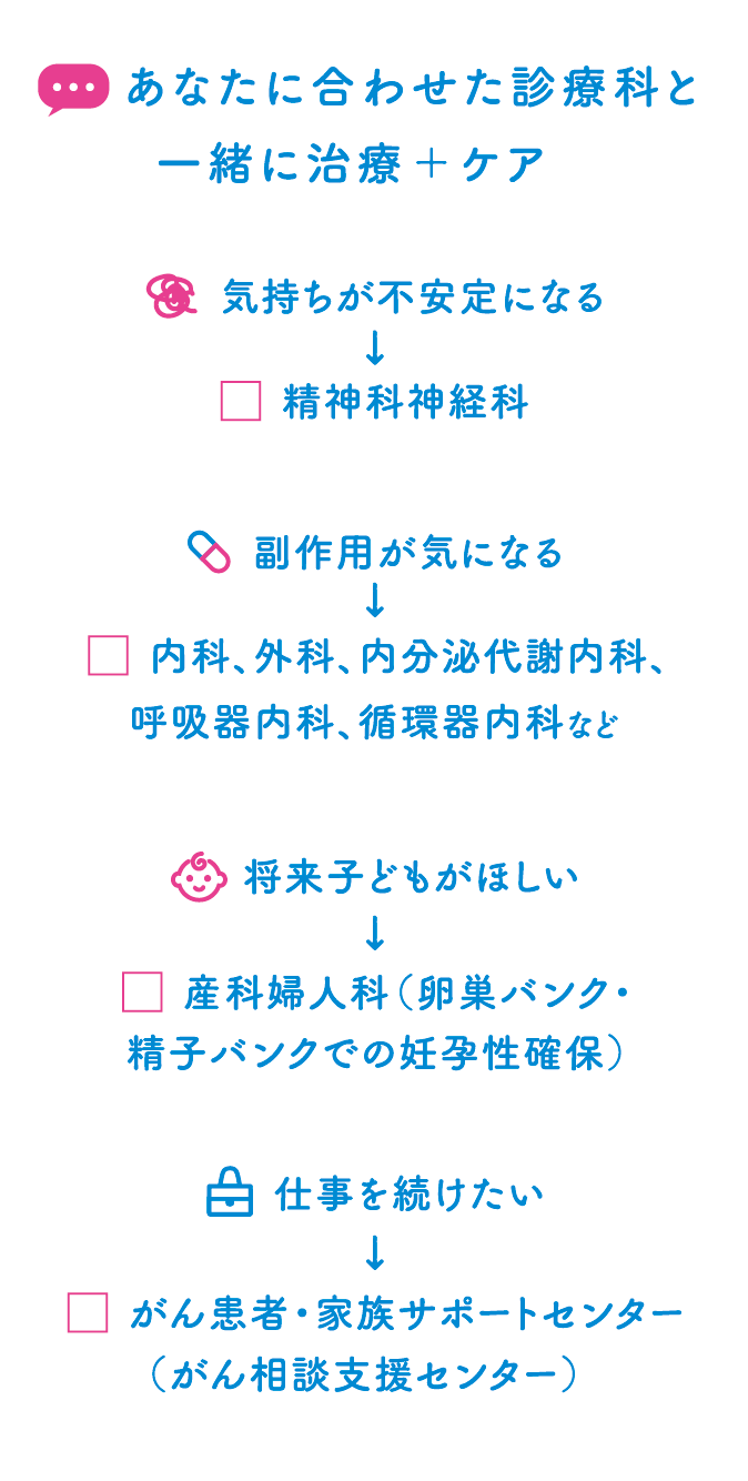 現在では治療の選択肢が増え、がんが転移などで進行していても、的確な治療で予後を延ばすことができるようになりました。また、がん治療薬の副作用は一昔前より格段に少なくなっており、つらい症状が出た場合でも医師と相談しながら薬量や服薬頻度をコントロールしていくことが可能です。生活の質を保ちながら、学業や子育て、仕事などを続けることも難しくなくなりました。