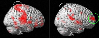機能的MRI.左図(健常者)では,task(膝蓋骨を外側へ押す)によって運動認知をつかさどる対側の一次体性感覚野が賦活しているが(白丸),右図(患者)では賦活されていない.将来の予測や情動的ストレス予測をつかさどる背外側前頭前野がtaskによって賦活されている(緑丸).