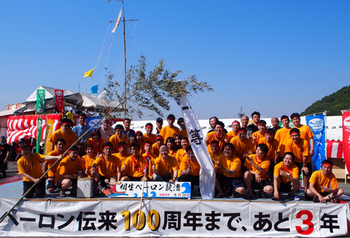 オープンレースの部、最終組4艇中1等賞。左から中央へ斜めに持った竹竿の先、白旗に一等と書いた「幟(のぼり)」をもらって記念撮影。